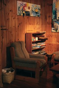 a living room with a chair and a book shelf farmhouse media console, reclaimed wood, rustic living room